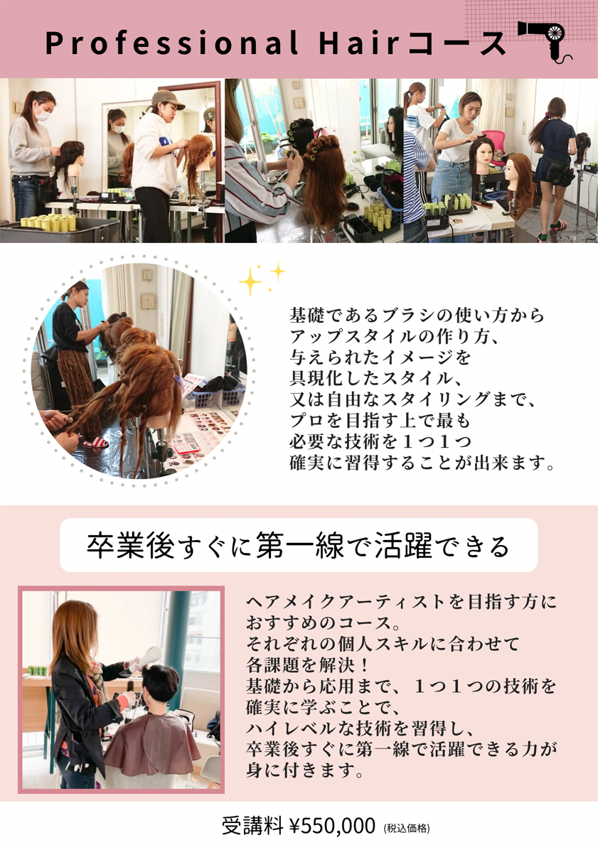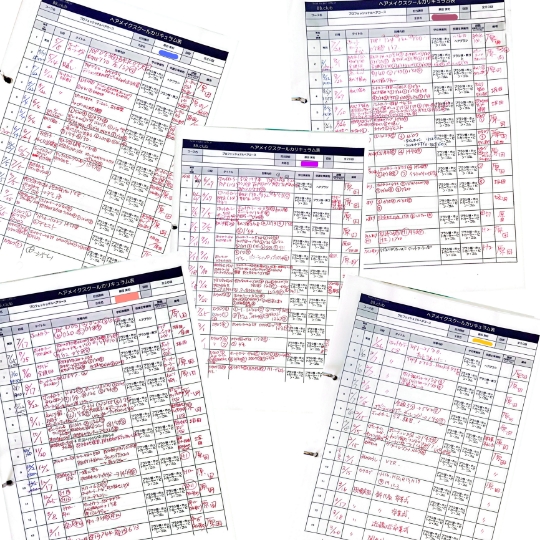 当スクールでは、技術を覚えるスピードが個人個人違う所に着目しました。 例えば、「ホットカーラー全頭巻き5分」と言うのが最初の課題となっています。 ある人は1コマ(2.5時間)のレッスンで、2コマで合格する人もいれば、4コマで合格する人もいます。 ここで問題が発生するのです。 直ぐにできるようになる人の心理は 「何故遅い人に合わせるのか?もっと次へと進みたい。」 ゆっくりペースの人の心理は、 「私もしかして、迷惑かけているかも・・・」 もしこれが決まったカリキュラムであれば、出来る人には物足りない内容であり、不器用な人には付いていけない内容となってしまいます。 そんなストレスを解消するために、当スクールでは白紙のカリキュラムを用意しました。 各課題をクリアにしたら次の課題へと進んでいく形です。 個人個人でカリキュラムが変わると言う事です。 直ぐに出来る人にはどんどん次の課題へと進んでもらい、不器用な人には出来る様になるまで丁寧に教えさせて頂く内容です。 それが下記画像となっています。 技術の指導者は弊社代表の原田実和。 いろいろなアドバイスや経験談を聞きながらレッスンを受ける事が出来るので、 本当にヘアメイクになりたいと思っている人には、当スクールがヘアメイクの近道であると言う答えが直ぐに理解できます。 また、ある程度出来る様になると、希望者には成人式前撮りや大学卒業式の現場からアシスタントとしてではなく、あなた自身に直接接客経験をしてもらいます。 場数を増やしてスピードアップやコミュニケーション力のスキルアップに繋げて行くのが目的です。 そうして徐々に『ヘアメイクの現場』を知って貰い、大手専門学校では知ることの出来ない本当のヘアメイクの仕事を体感して理解して貰う事が出来ます。 当スクールを卒業する頃には、入学時全く出来なかったヘアセットやヘアアレンジが沢山出来る様になっています。正直、出来ないまま卒業したと言う生徒さんは当スクールには一人も居ません。これが当スクールの指導能力の特徴となっています。 「年数を通えばいい」ではなく、たった20コマでここまで出来る様になるのです。 そのBB.clubプロフェッショナルヘアコースの様子と生徒作品をご覧ください。 ◆BB.club プロフェッショナルヘアコース スクール風景 ◆BB.club プロフェッショナルヘアコース 在校生&卒業生の作品集 如何でしょうか。 当スクール生たちは、2年かけて通う訳でもなく、たった20コマ消化することでここまで出来る様になるのです。 早ければ2コマずつ受講する事で10回の通学で卒業が可能となります。 期間でいうと早くて3ヶ月、平均6ヶ月で技術を習得し卒業されていきます。 受講問い合わせフォームへ