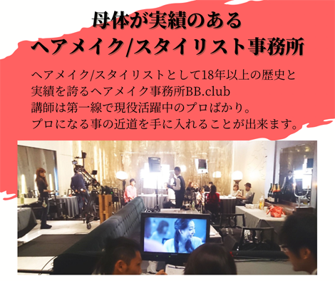 ヘアメイクスクールBB.clubでは、第一線で活躍しているベテランヘアメイクが少人数制で教えています。今はどうすれば良いのか分からない方も、決められない方も、急いでいる方もスクール通いしながら新しい自分を見つけて下さい。ヘアメイクスクールBB.clubではそんなあなたを全面的にバックアップします。
